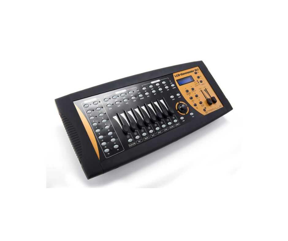 Stairville LED-Commander 16/2 on professionaalne 16-kanaliline DMX-valgustuspult, mis võimaldab juhtida kuni 16 erinevat valgustusseadet kahes DMX-universumis. Seade sobib suurepäraselt ürituste, kontsertide, klubide ja lavade valguse juhtimiseks.